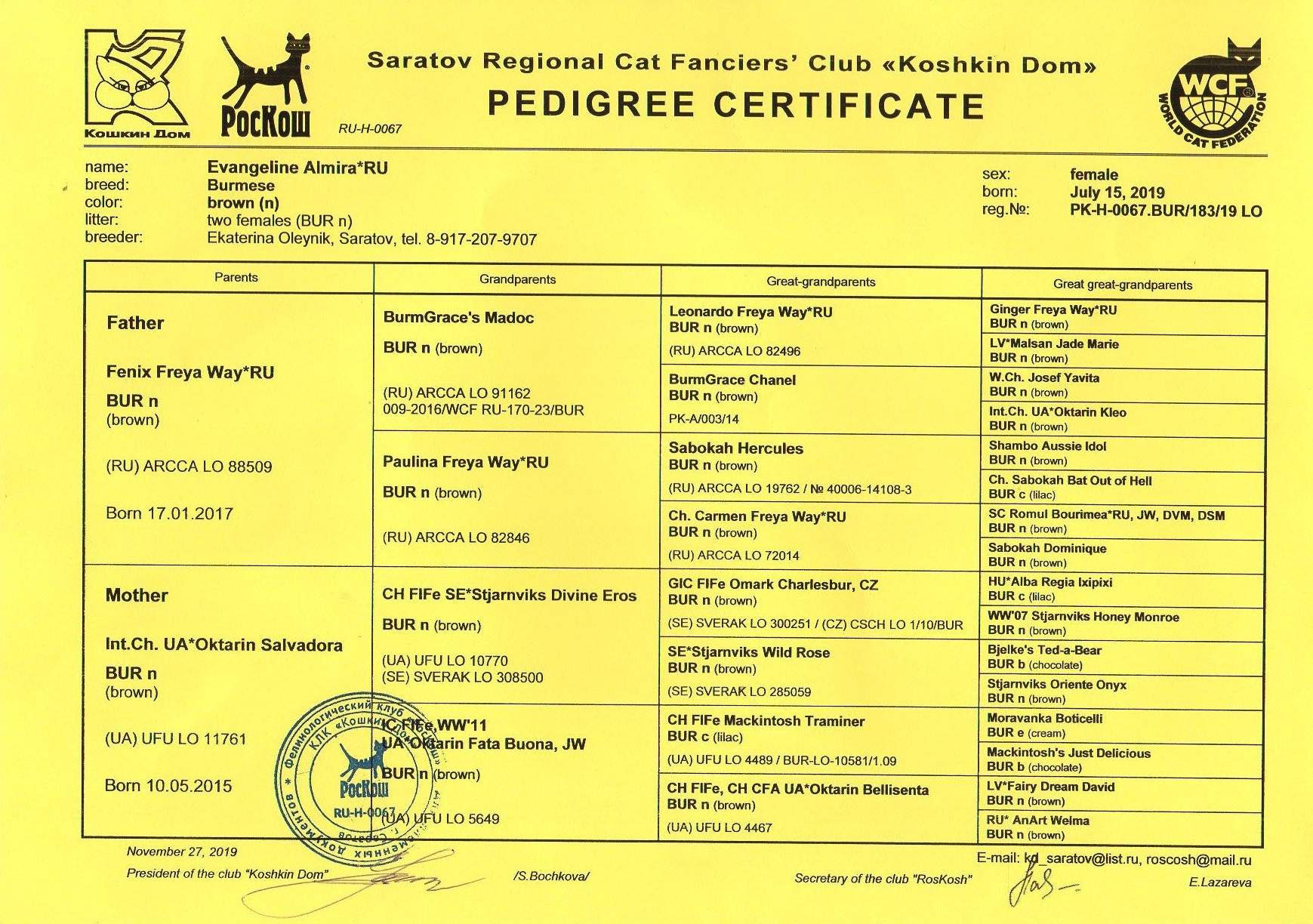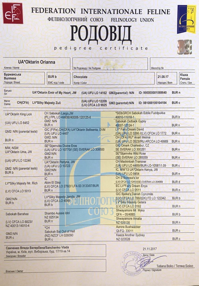 СH. UA*Oktarin OriannaЧемпион породы. Кошка, шоколадная, родилась 21.08.2017г. Tests: GM2 - N/N, HK - N/N Папа: UA*Oktarin Emir of My Heart, JW Мама: СH (CFA) LV* Silk Majesty Zuli Владелец: Олейник Екатерина Заводчик: Санченко Влада |