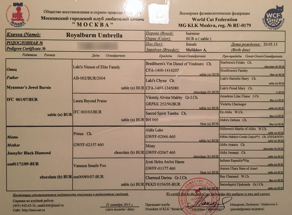 Моя первая бурманская кошечка. Первая влюбленность в эту удивительную породу. Эта кошка обладает истинным бурманским характером. Очень спокойная, понимающая и все прощающая девочка, подарившая нам счастье общения и ставшая началом нашей бурманской истории. Сейчас она счастливо живет у моих родителей. Мы часто видимся и, мне кажется, она меня простила за то, что мы не вместе. Выведена из разведения. |